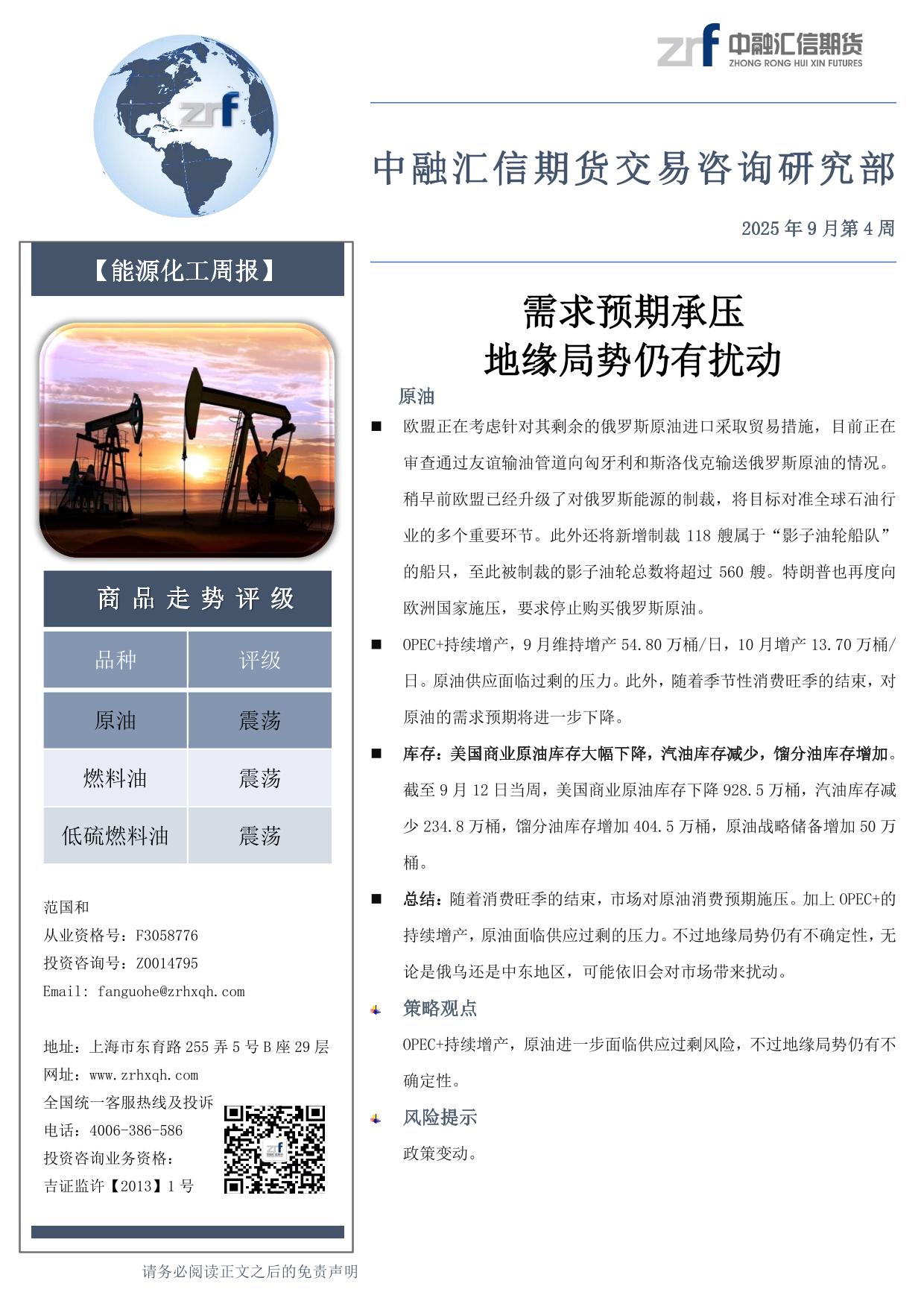 20250922中融汇信期货—原油燃料油周度报告—需求预期承压 地缘局势仍有扰动