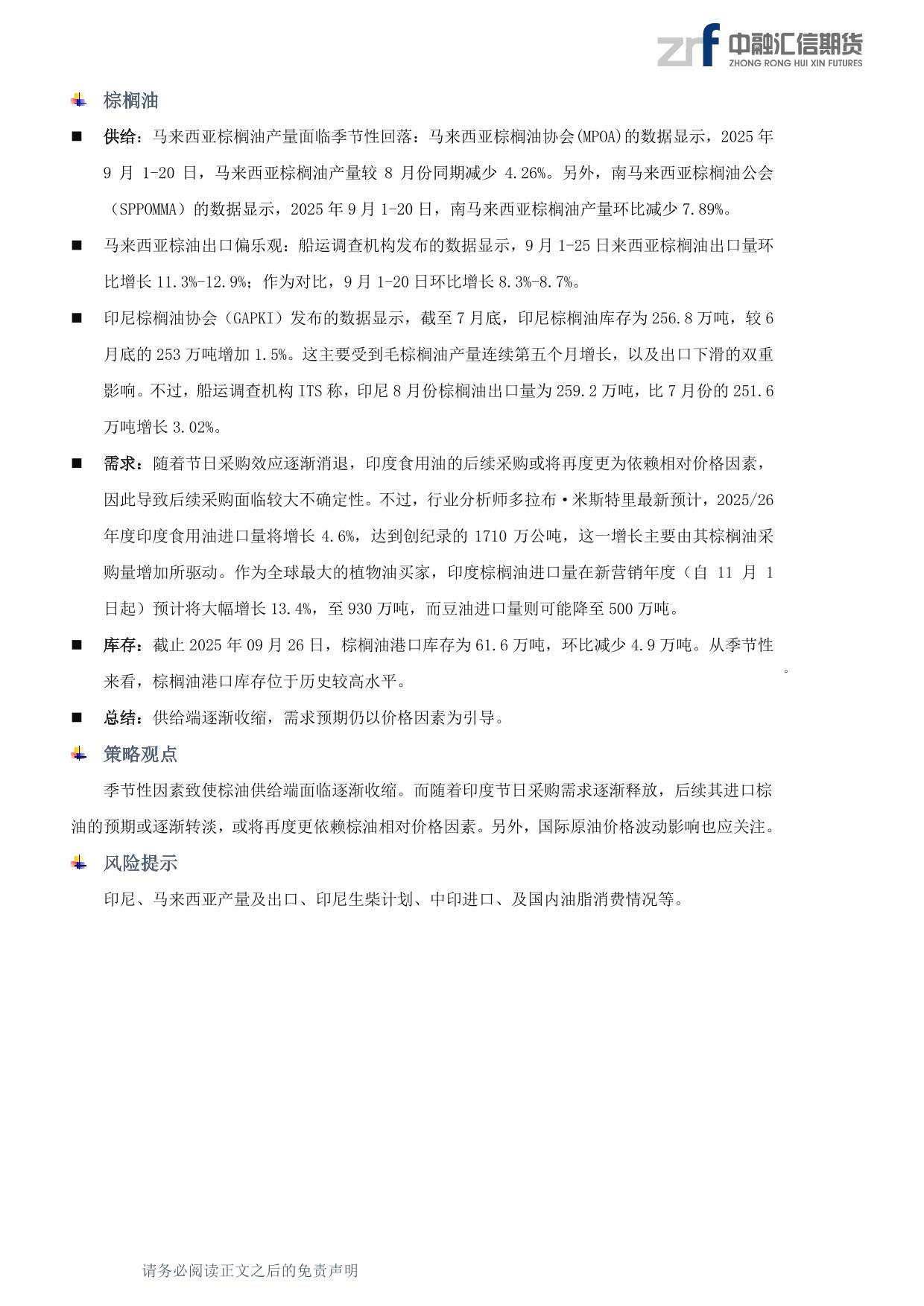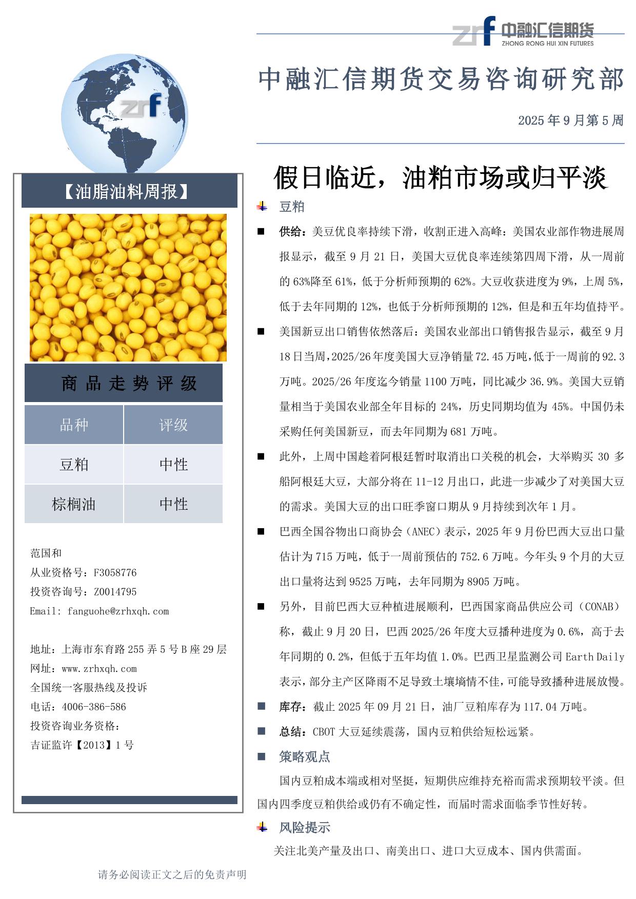 20250929中融汇信周报—假日临近,油粕市场或归平淡