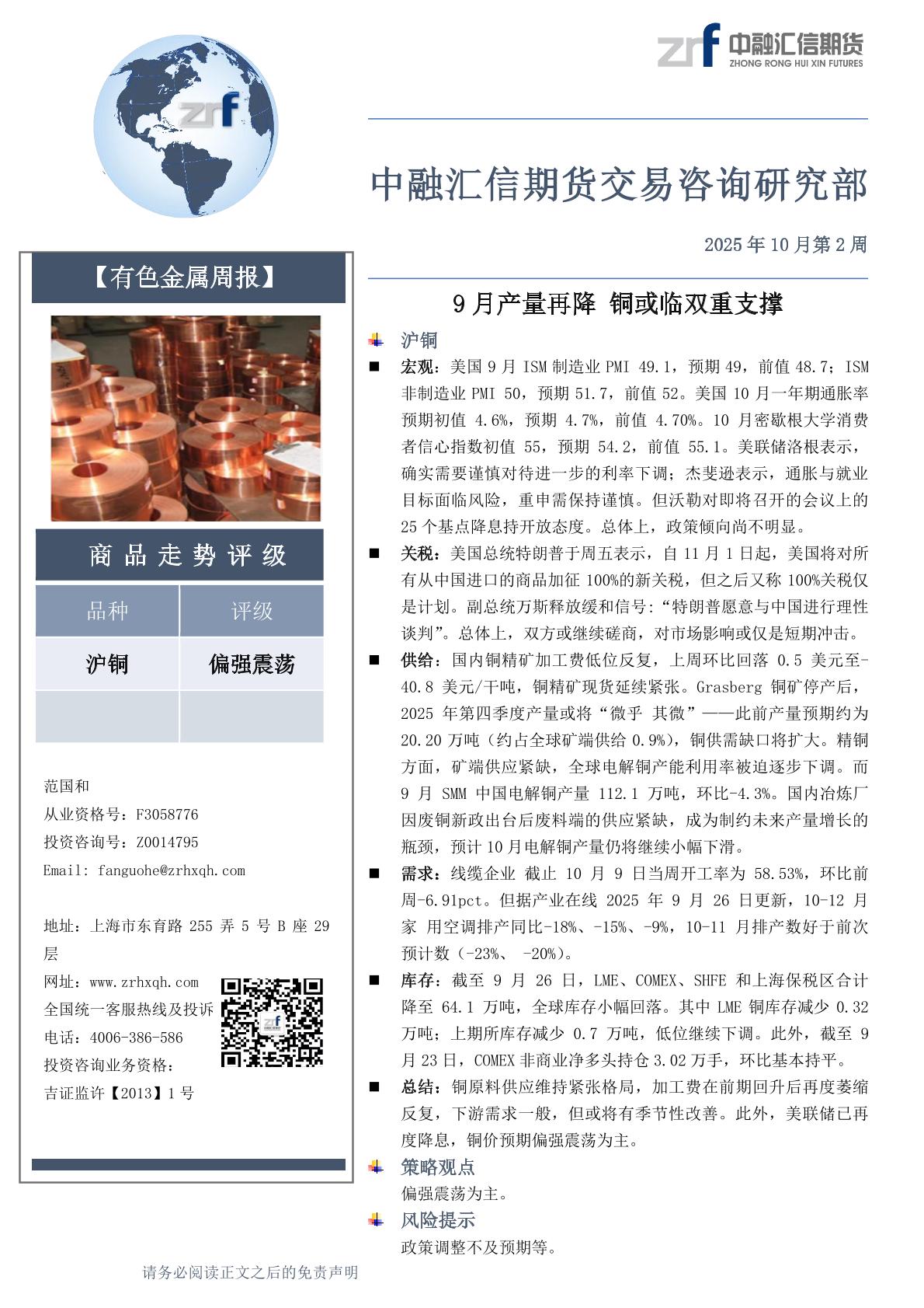 20251013中融汇信期货—沪铜产业周报—9月产量再降 铜或临双重支撑