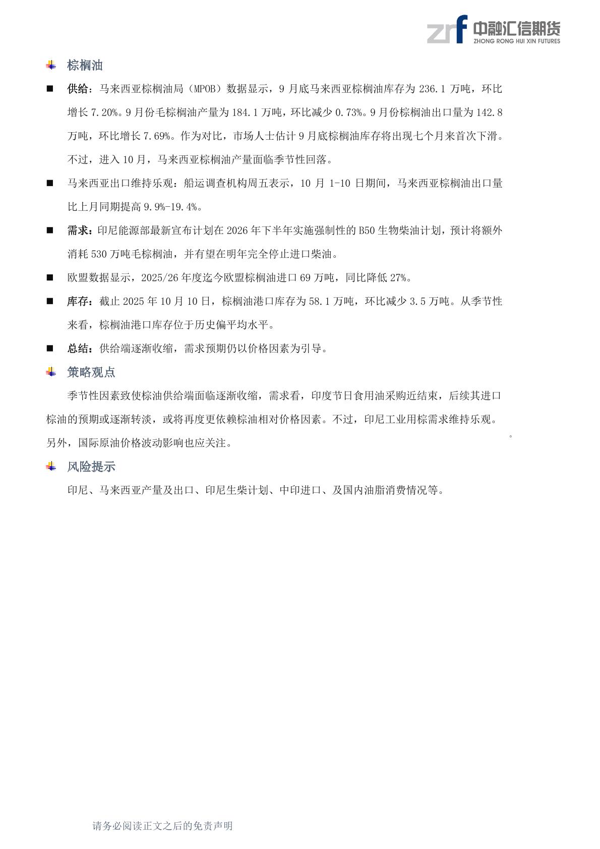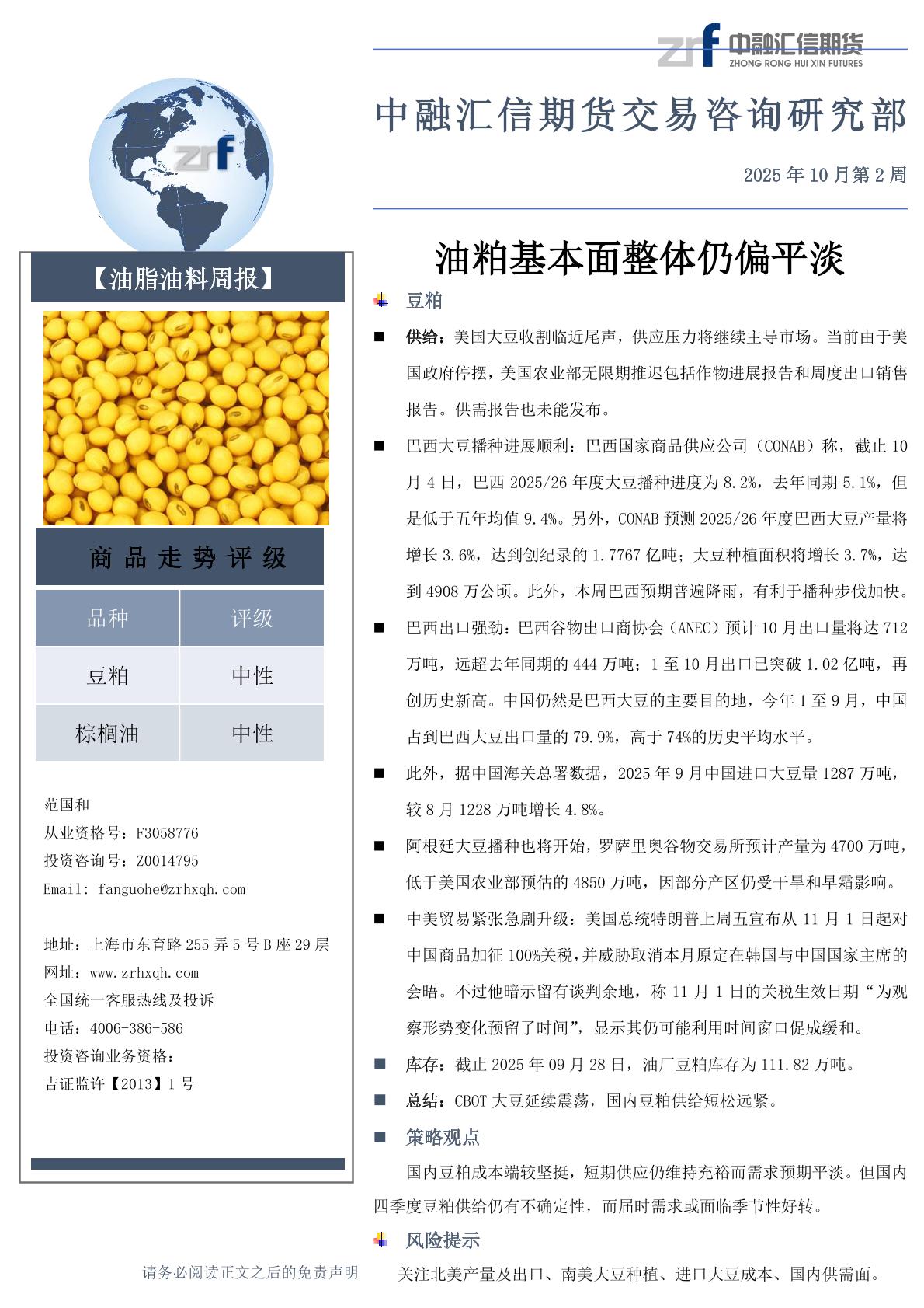 20251013中融汇信周报—油粕基本面整体仍偏平淡